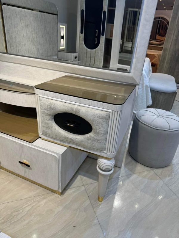غرفه نوم مودرن 1031 المكونات: سرير كبير ، 2 كمود، تسريحة مع كرسي استيل، دولاب كبير. الخامات: خشب زان أحمر