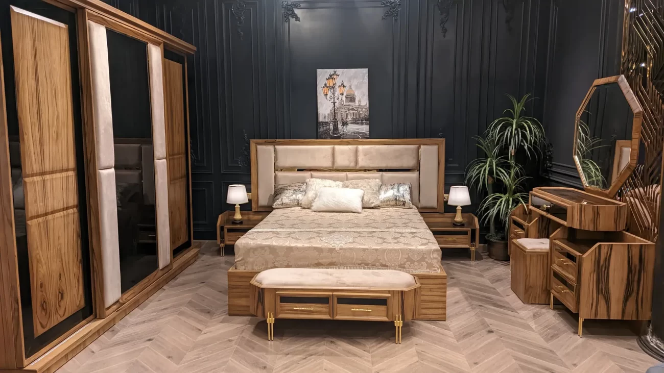 غرفه نوم مودرن 1001 المواصفات: القشرة الخشبية الطبيعية تعطي للغرفة رونق خاص وفريد، فتأخذك إلى أجواء الطبيعة الخلابة مع أجواء