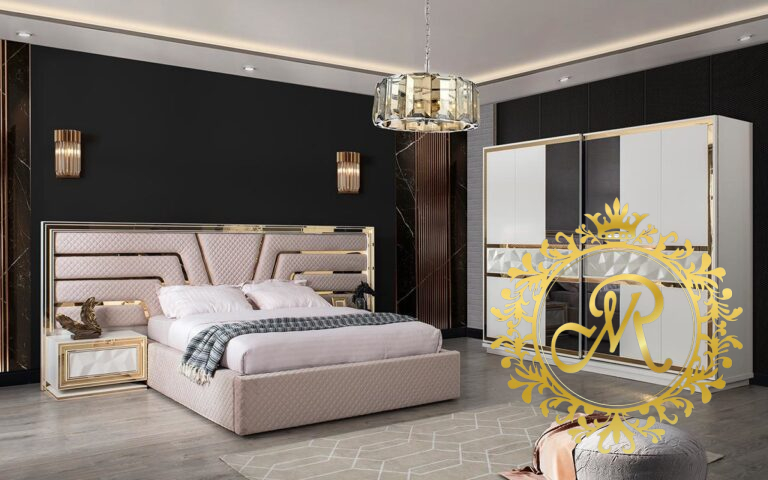 غرفه نوم مودرن 1018 المكونات: سرير كبير ، 2 كمود، تسريحة مع بف، دولاب كبير. الخامات: خشب زان أحمر مجفف
