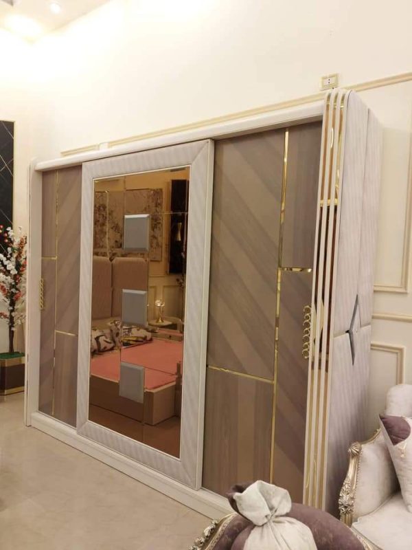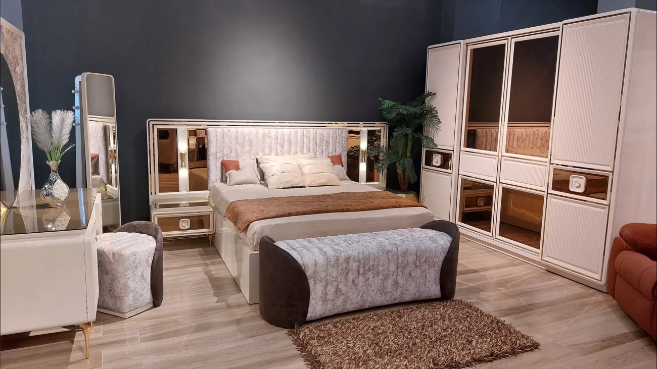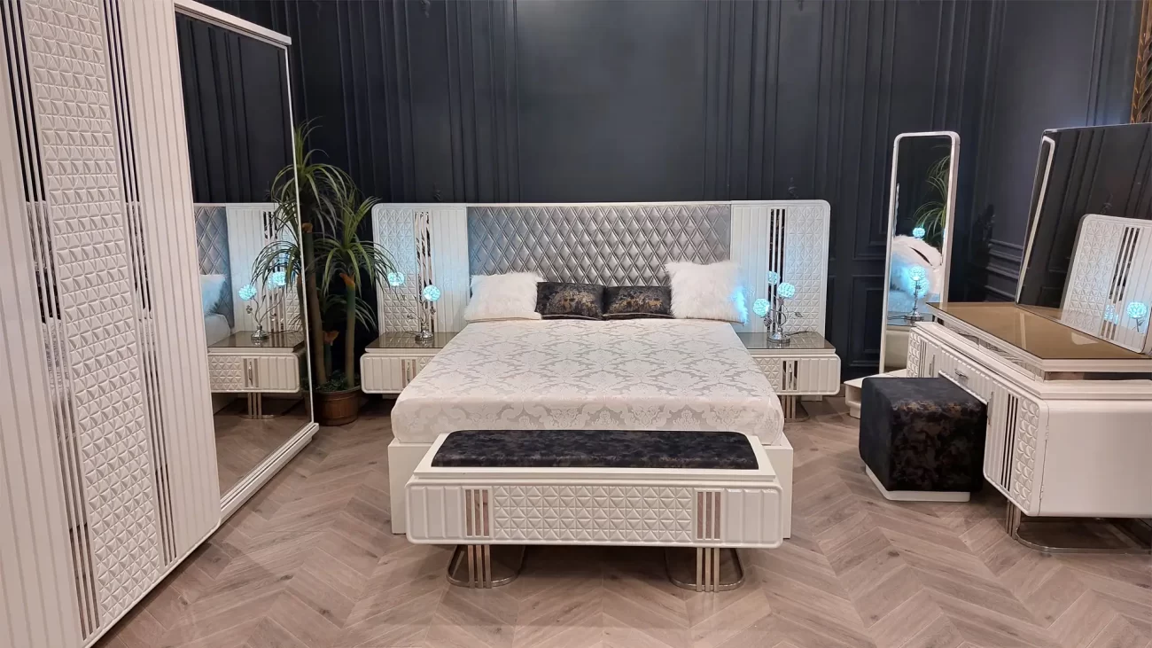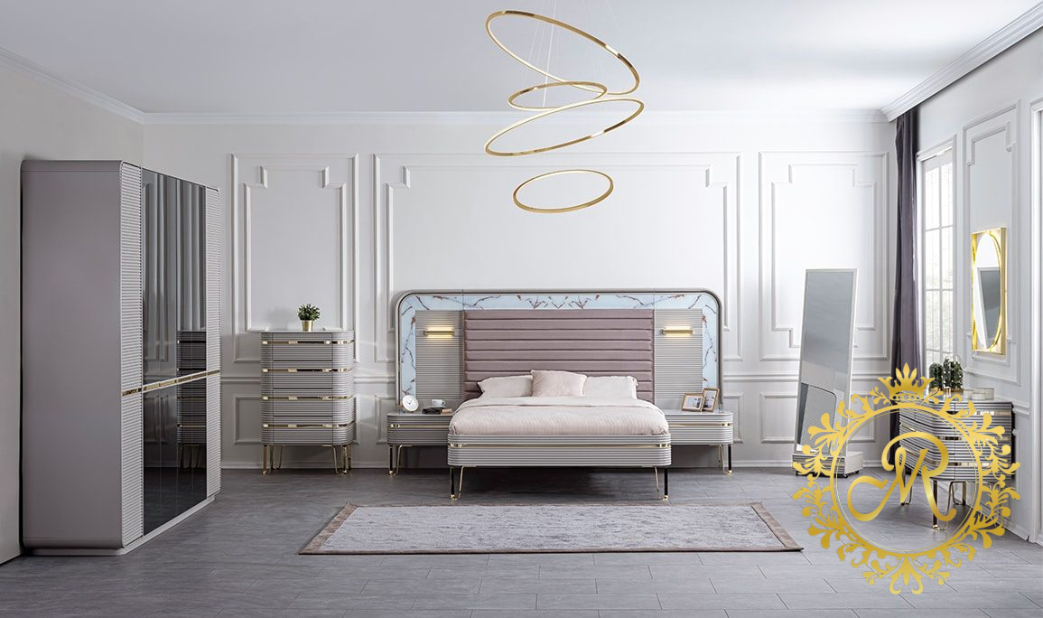 غرفه نوم مودرن 1006 المواصفات: لارين غرفة نوم مودرن لها شكل مميز وبراق، وذلك لأنها مجلدة بشرائط ستانلس في جميع