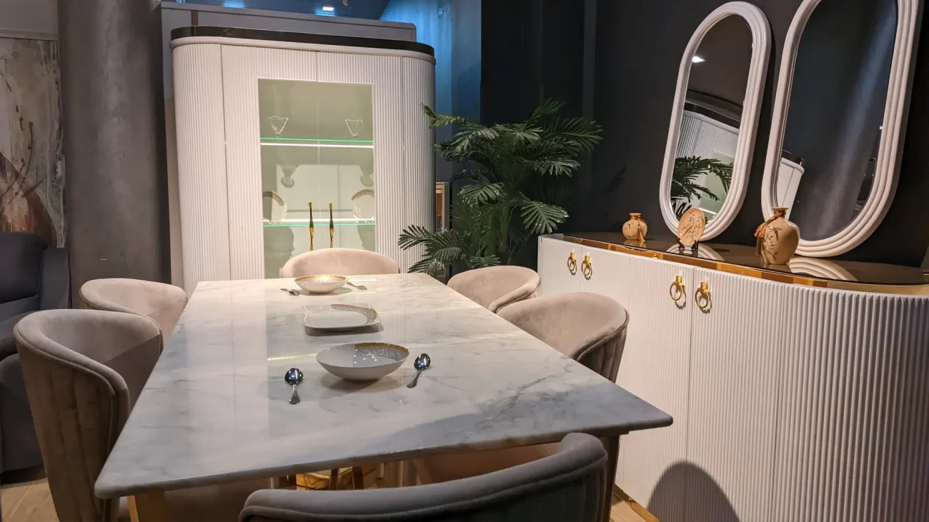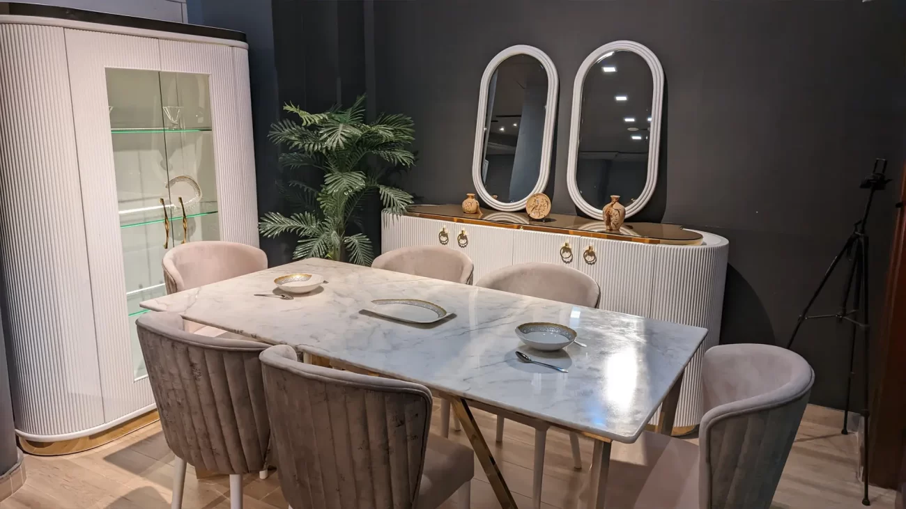 سفره مودرن 4013 المكونات: 1 نيش كبير، بوفية مع برواز، طاولة مع 6 كراسي. الخامات: خشب زان أحمر مجفف شديد