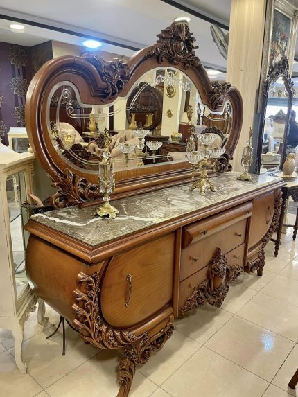 سفره كلاسيك التاج A004 المكونات: 1 نيش كبير، بوفية مع برواز، طاولة مع 6 كراسي صالون. الخامات: خشب زان أحمر