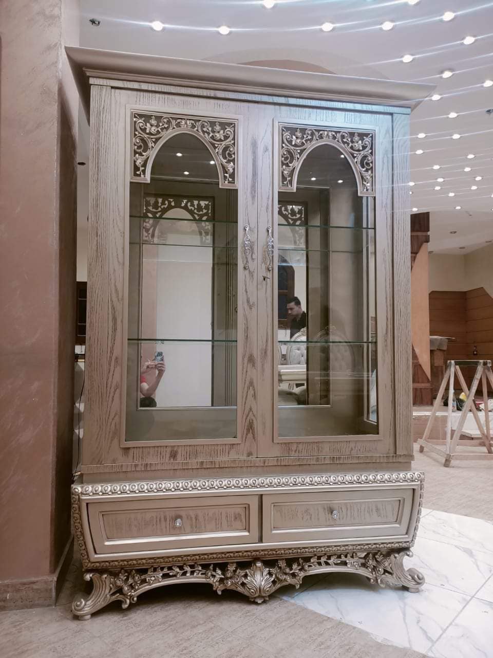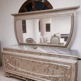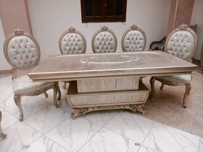 - 1 نيش كبير، بوفية مع برواز، طاولة مع 6 كراسي صالون.