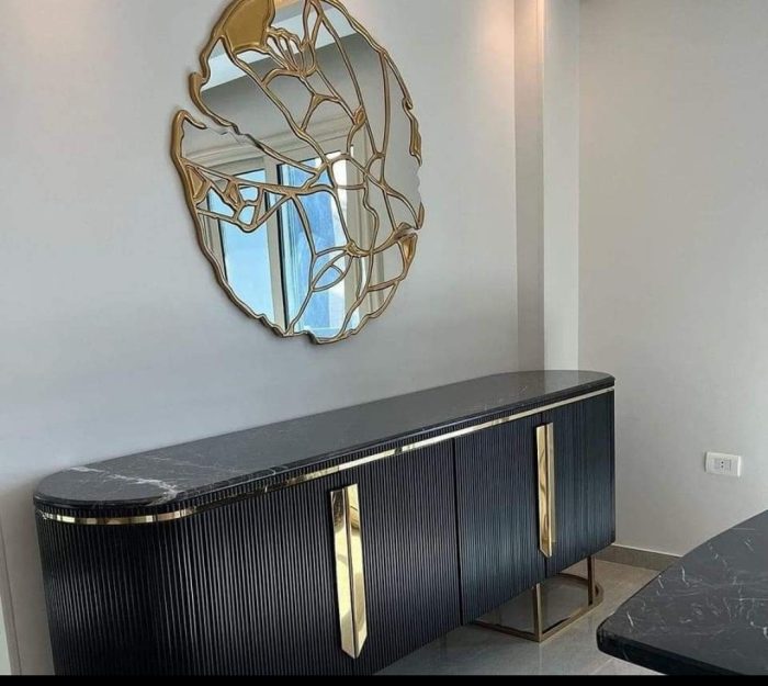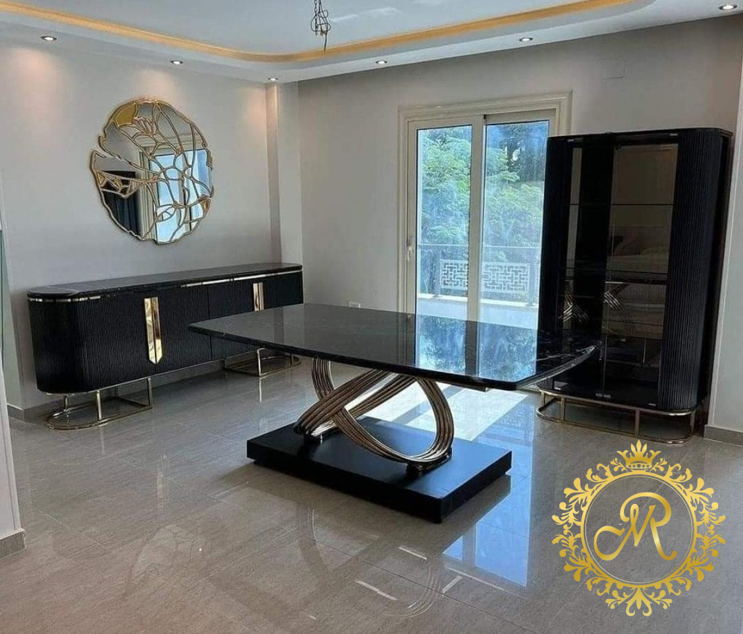 سفره مودرن تركي 4014 المكونات: 2 نيش صغيرطولي ، بوفية مع برواز،بوفيه مستطيل مع برواز . طاولة مع 6 كراسي.