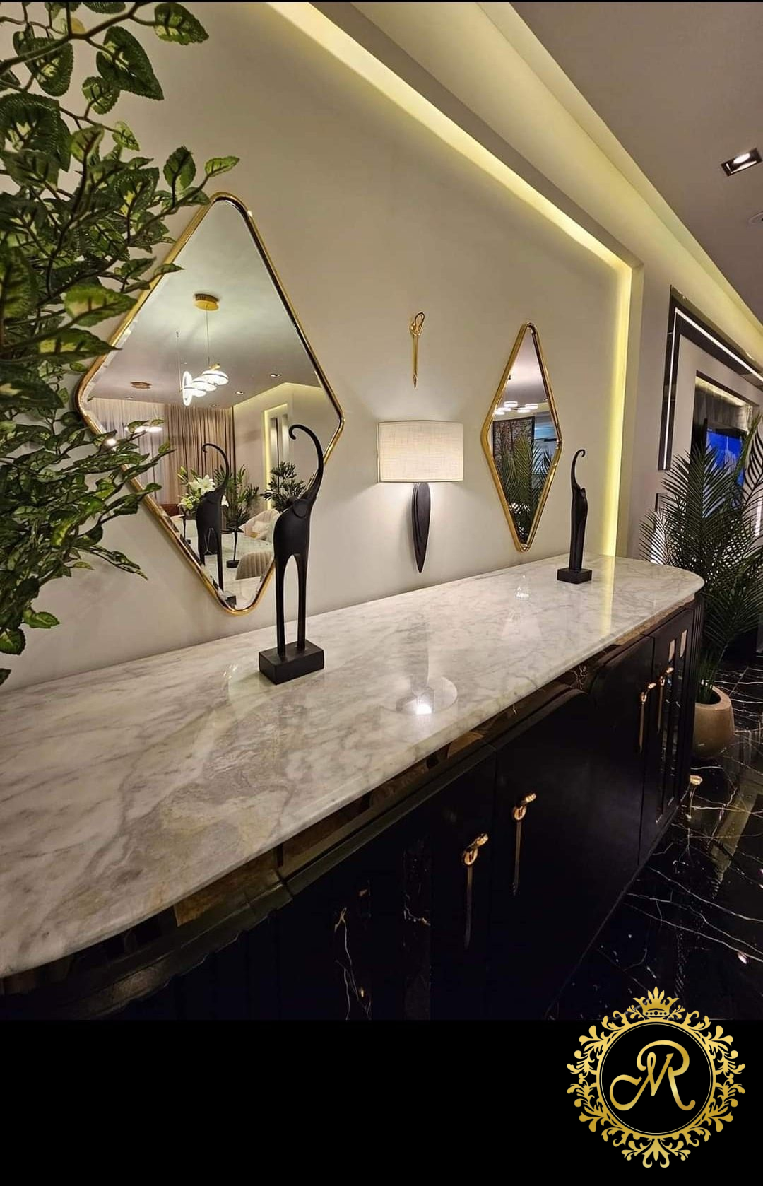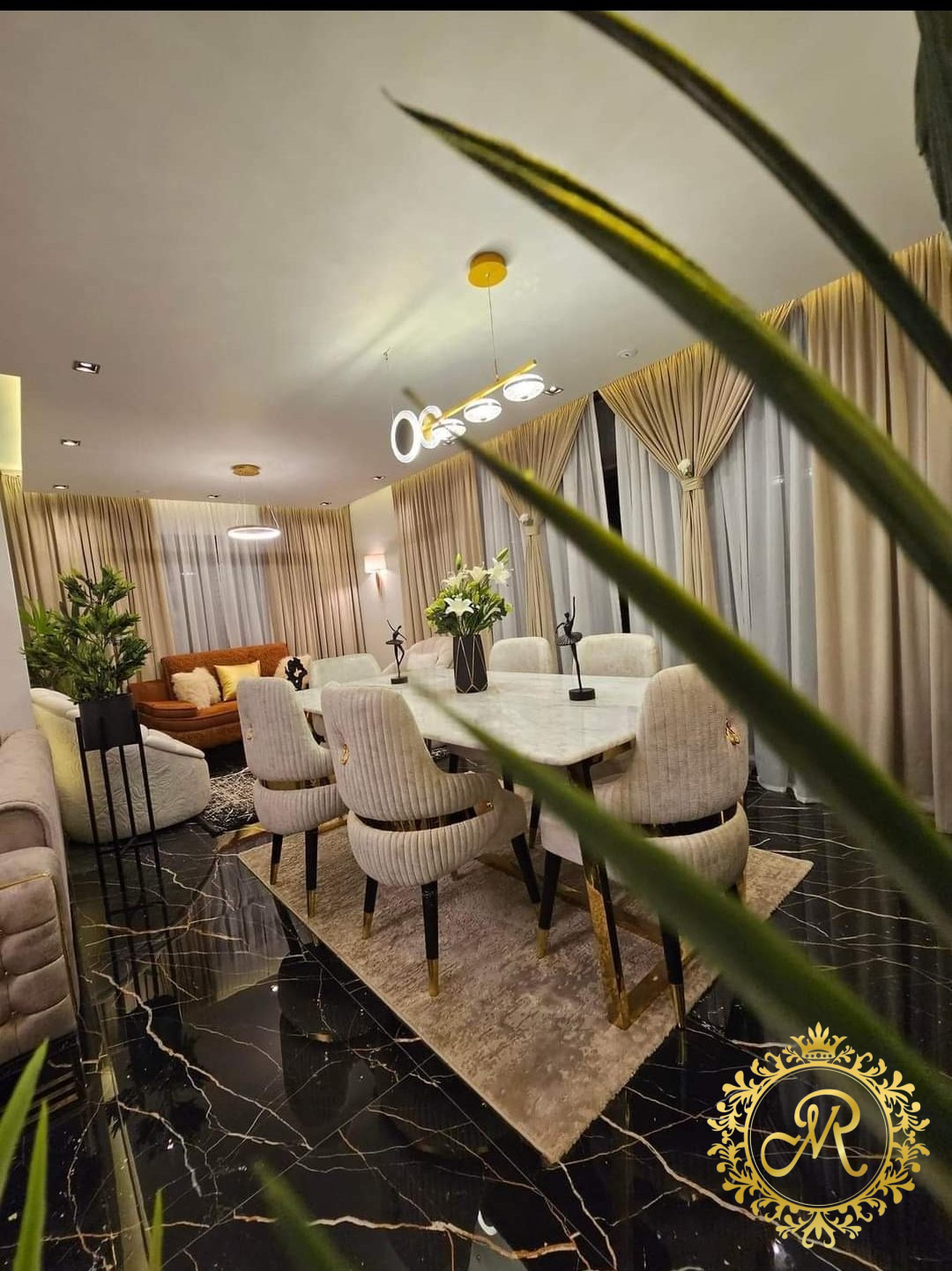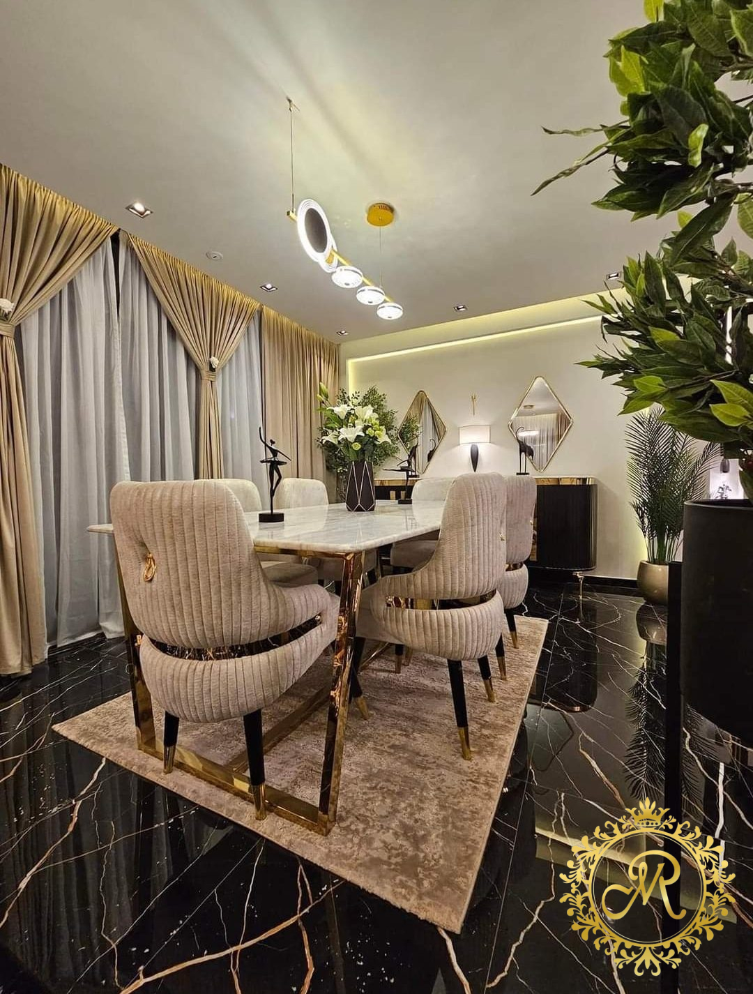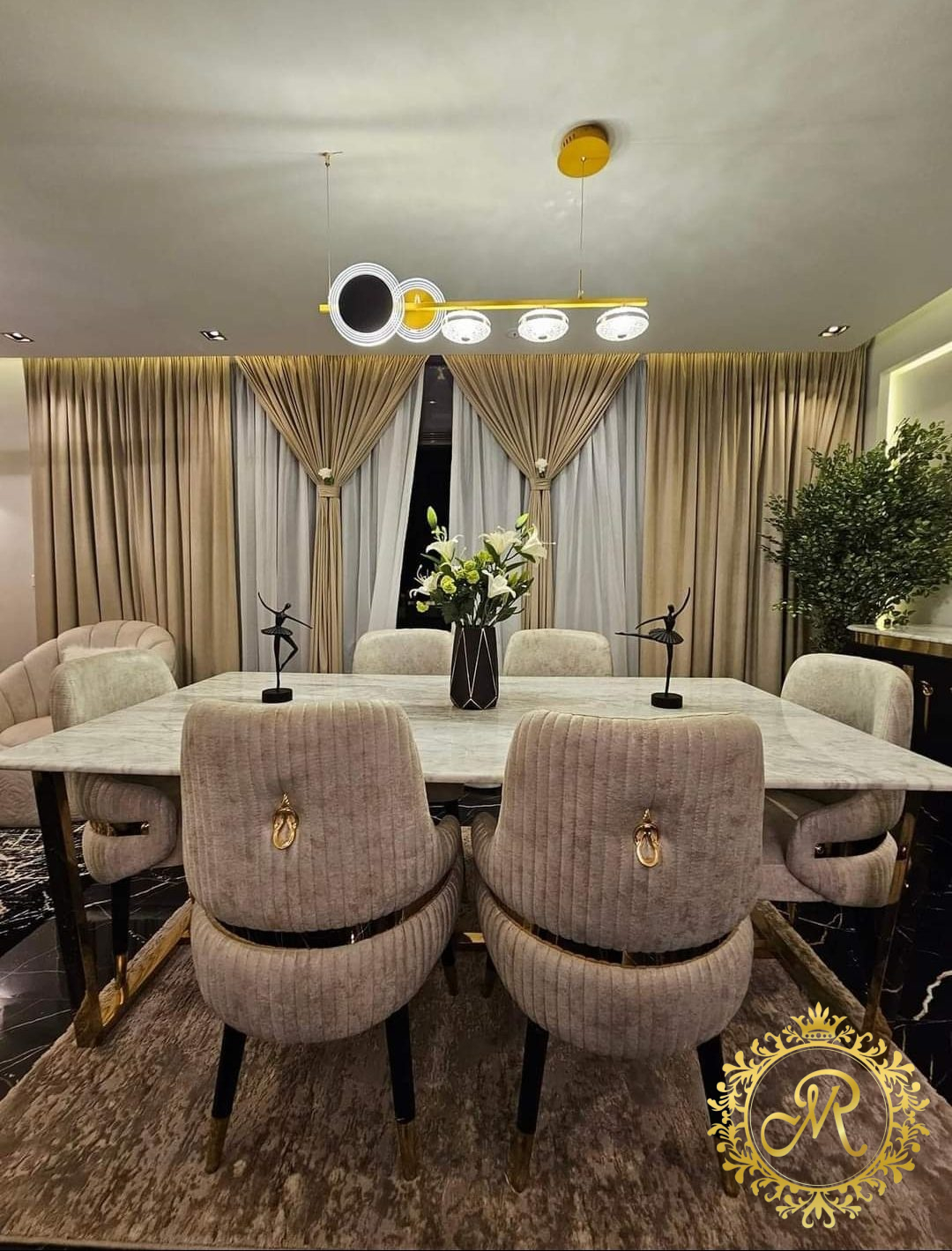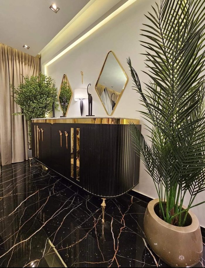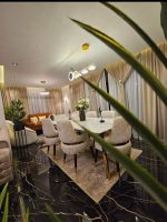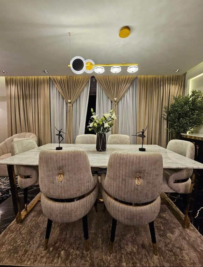 - 2 نيش صغيرمربع ، بوفية مع برواز، طاولة مع 6 كراسي.