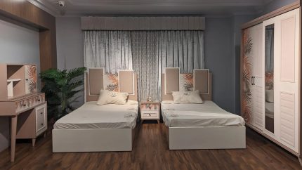 • غرفة شبابية أنيقة وعملية، تتميز بسريرين مغلفين بالقماش وبظهر سرير منجد ومريح.