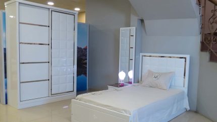 • دولاب الغرفة يأتي بحجم متوسط، بثلاث أبواب ليناسب حجم الغرفة ولا يقلل من عملية الغرفة.