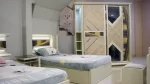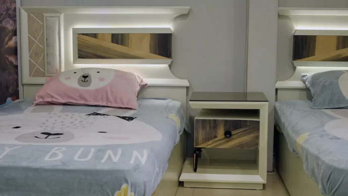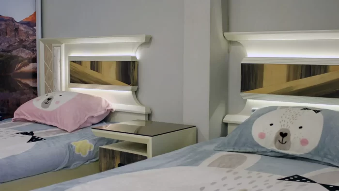 غرفه اطفال 7003 المواصفات: غرفة شبابية أنيقة وعملية، تتميز بسريرين مغلفين بالقماش وبظهر سرير منجد ومريح. المساحات الصغيرة تتطلب حلول