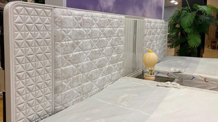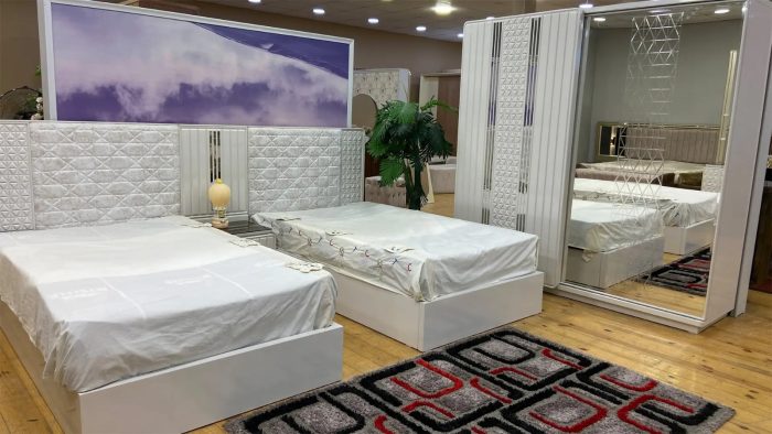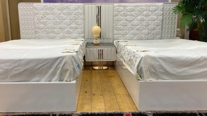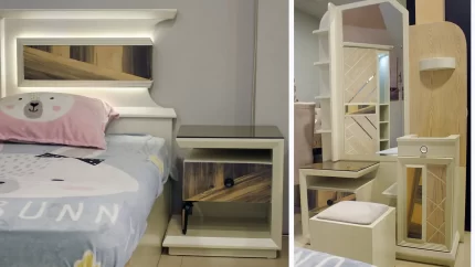 غرفه اطفال 7001 المواصفات: غرفة شبابية أنيقة وعملية، تتميز بسريرين مغلفين بالقماش وبظهر سرير منجد ومريح. المساحات الصغيرة تتطلب حلول