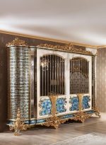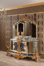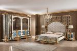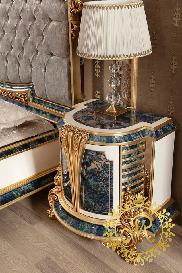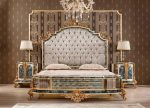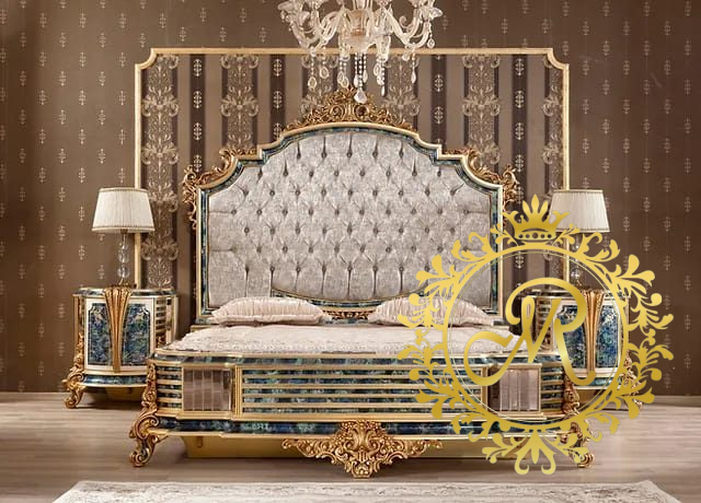 • ‌الطلاء الذهبي مع الرسم اليدوي مع الزخرفة والنحت اليدوي الدقيق والمتقن، كل ذلك بالإضافة إلى ظهر السرير الكابتونيه من القماش القطيفة الناعم، يجعل للغرفة جمالا لا يوصف.