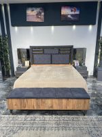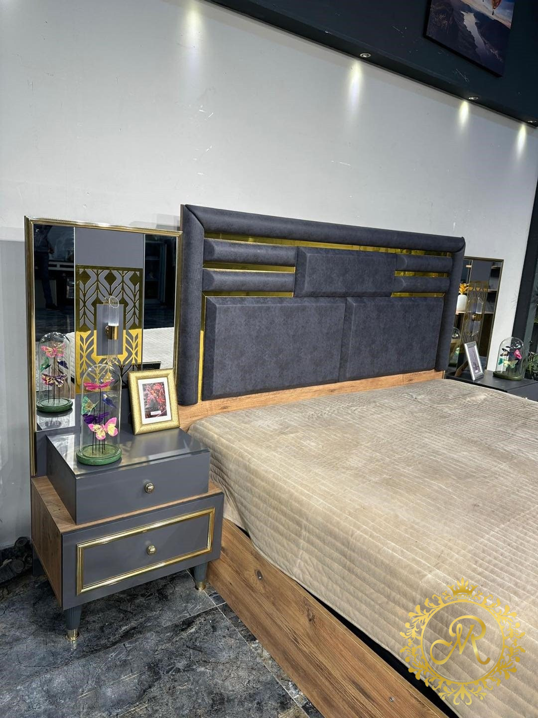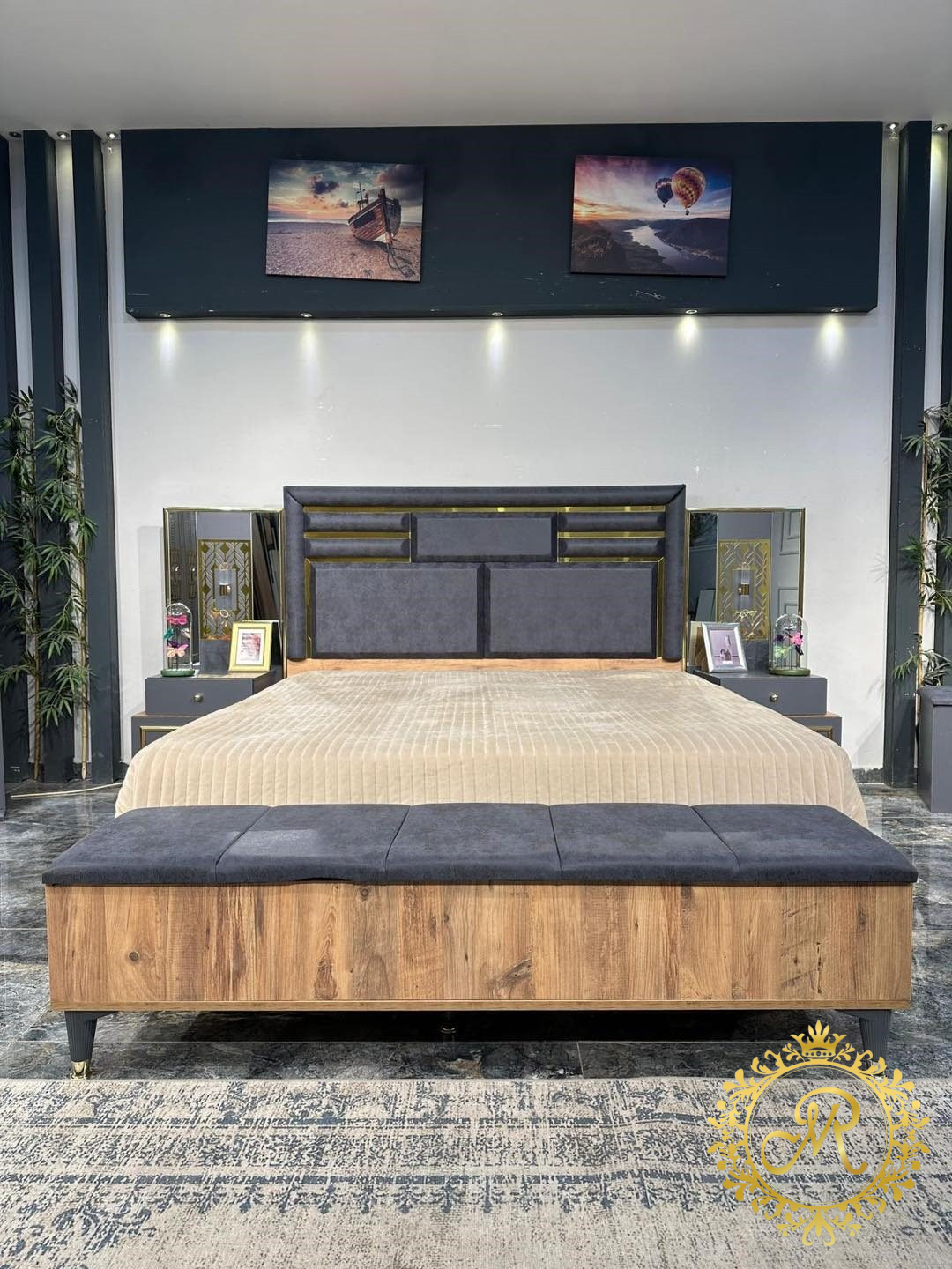 • سرير كبيرمع بانكت، 2 كمود، تسريحة مع كرسي استيل، دولاب كبير.
