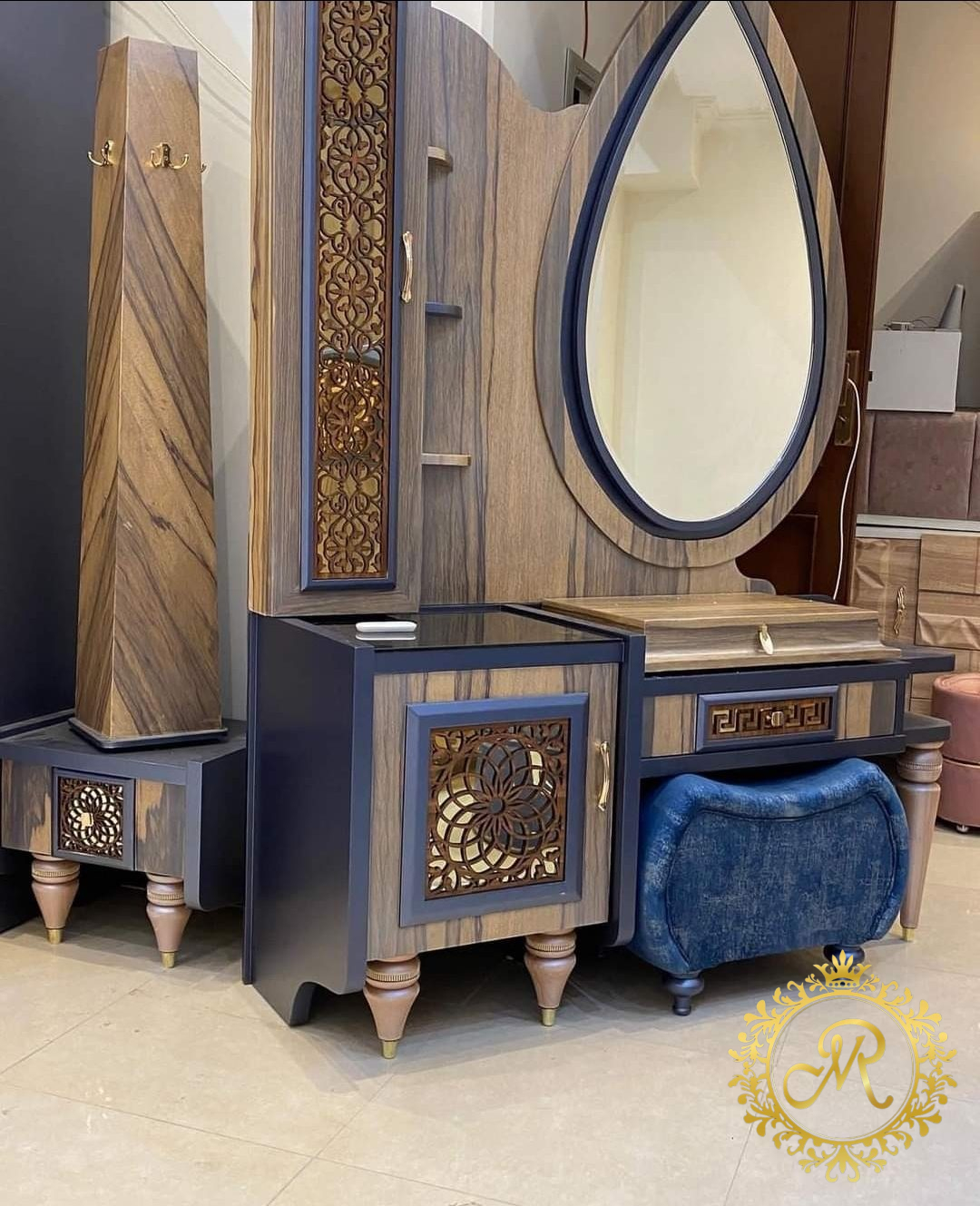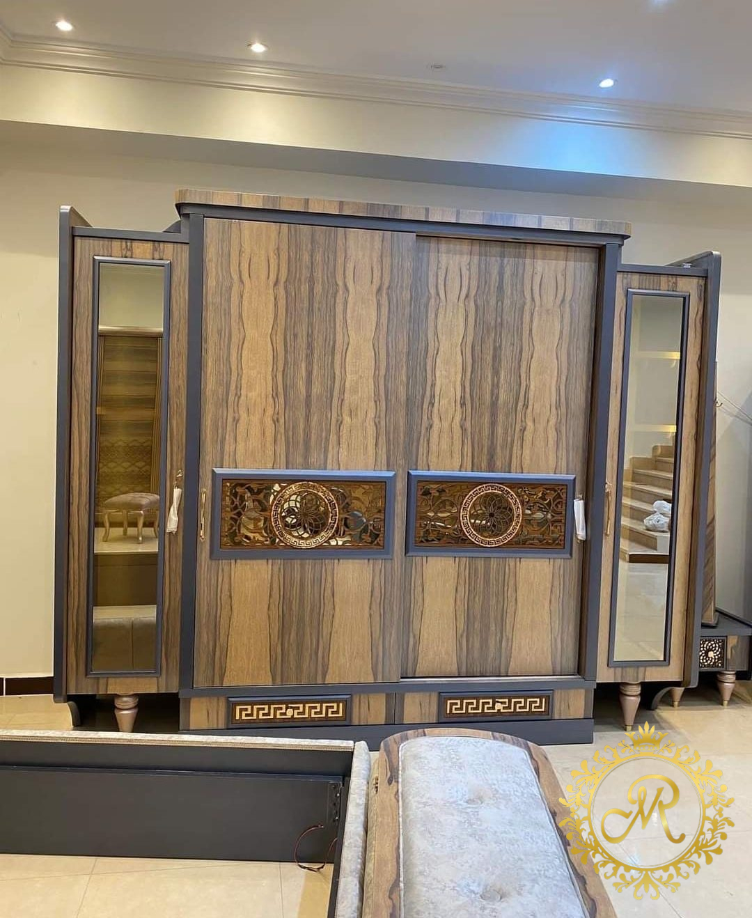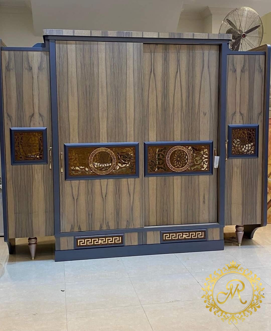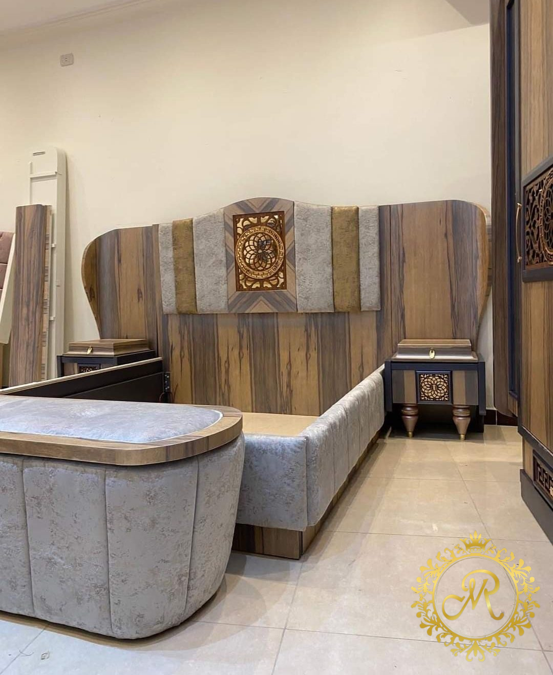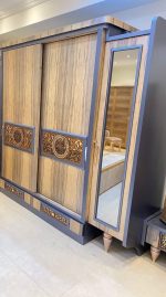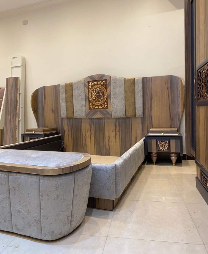 - سرير كبيرمع بانكت صحاره ، 2 كمود، تسريحة مع بف، دولاب كبير.