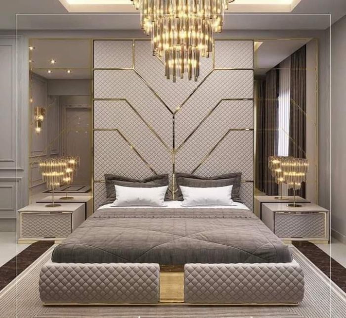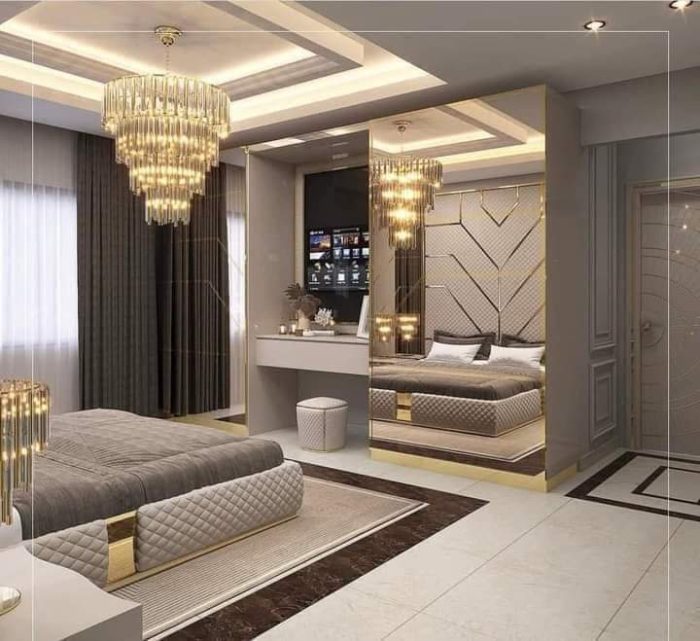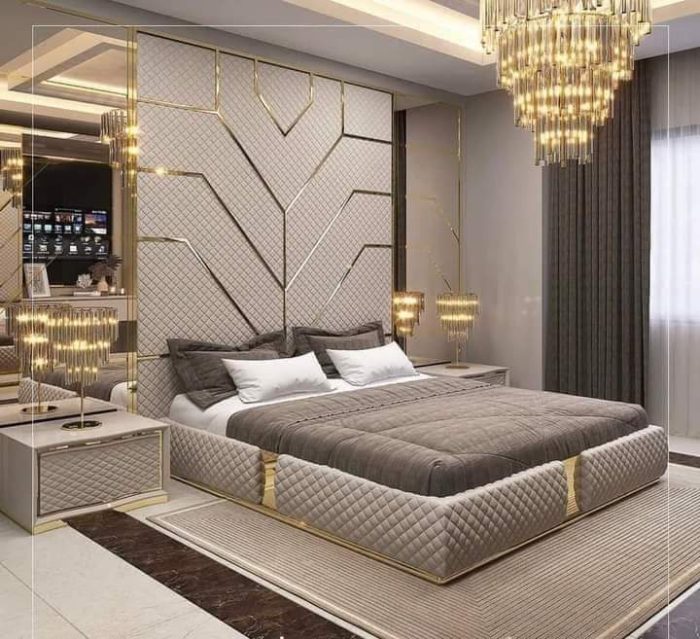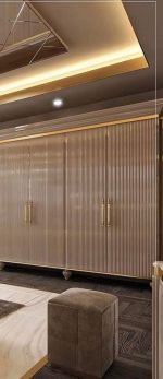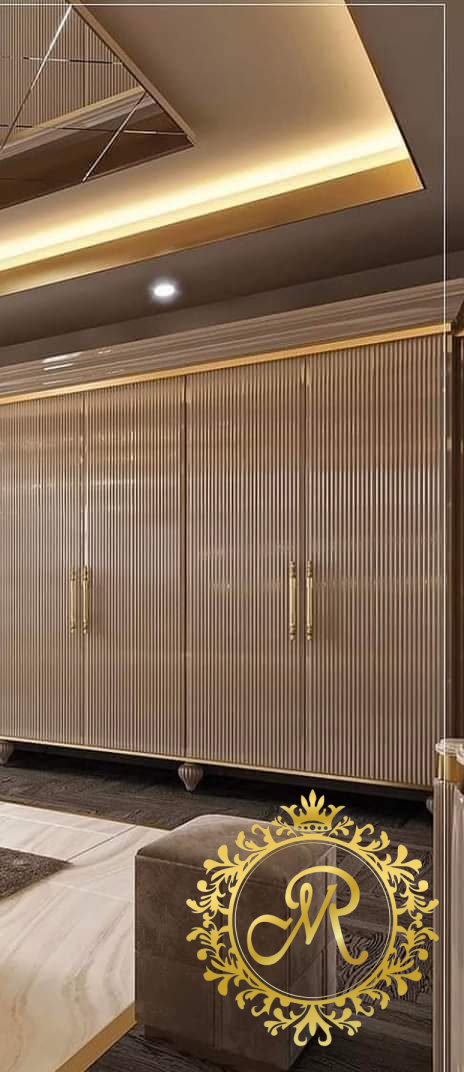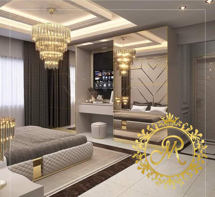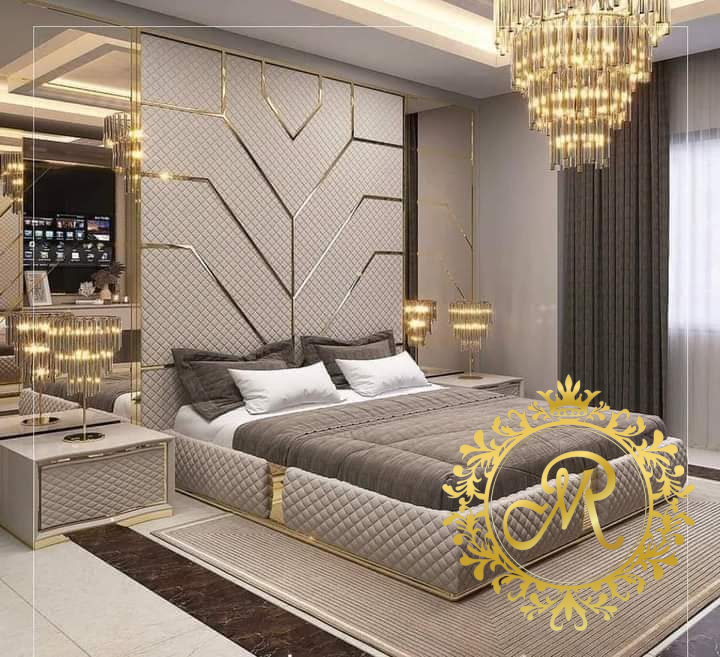 - سرير كبيرمع بانكت ، 2 كمود، تسريحة مع بف، دولاب كبير.