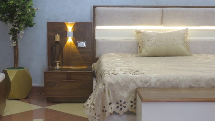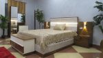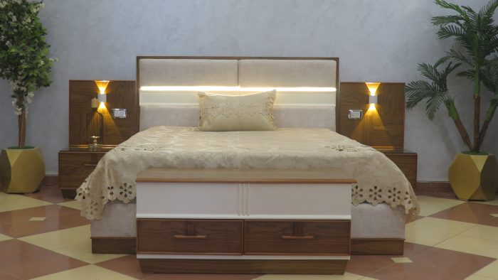 غرفه نوم مودرن 1004 المواصفات: غرفة نوم مودرن 2024 مميزة بكل تفاصيلها الجميلة والرقيقة. تتميز بظهر سرير قماشي مبطن