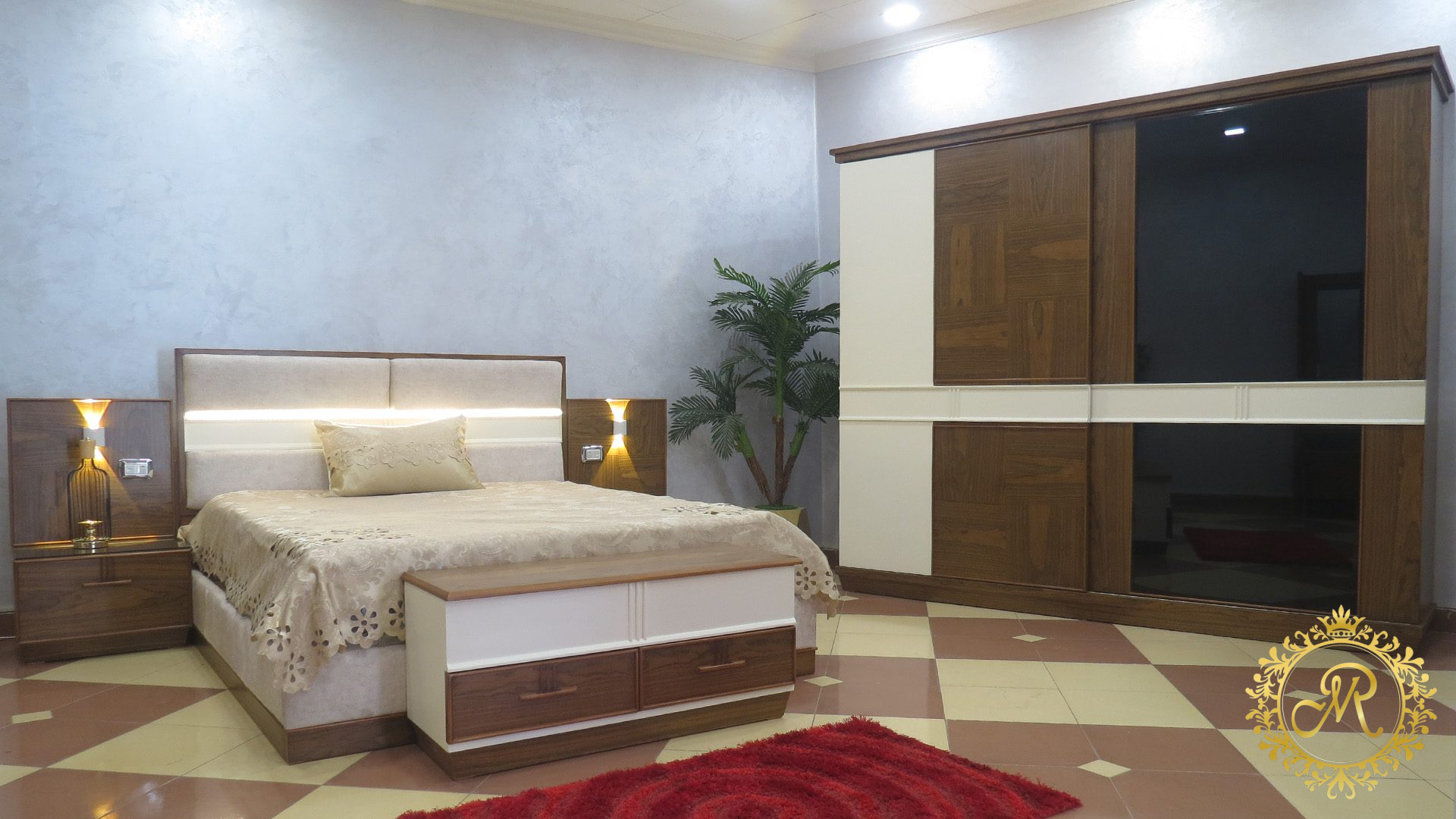 • سرير كبير مع بانكيت، 2 كمود، تسريحة مع بف، دولاب كبير.