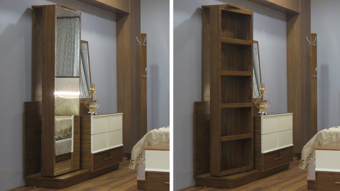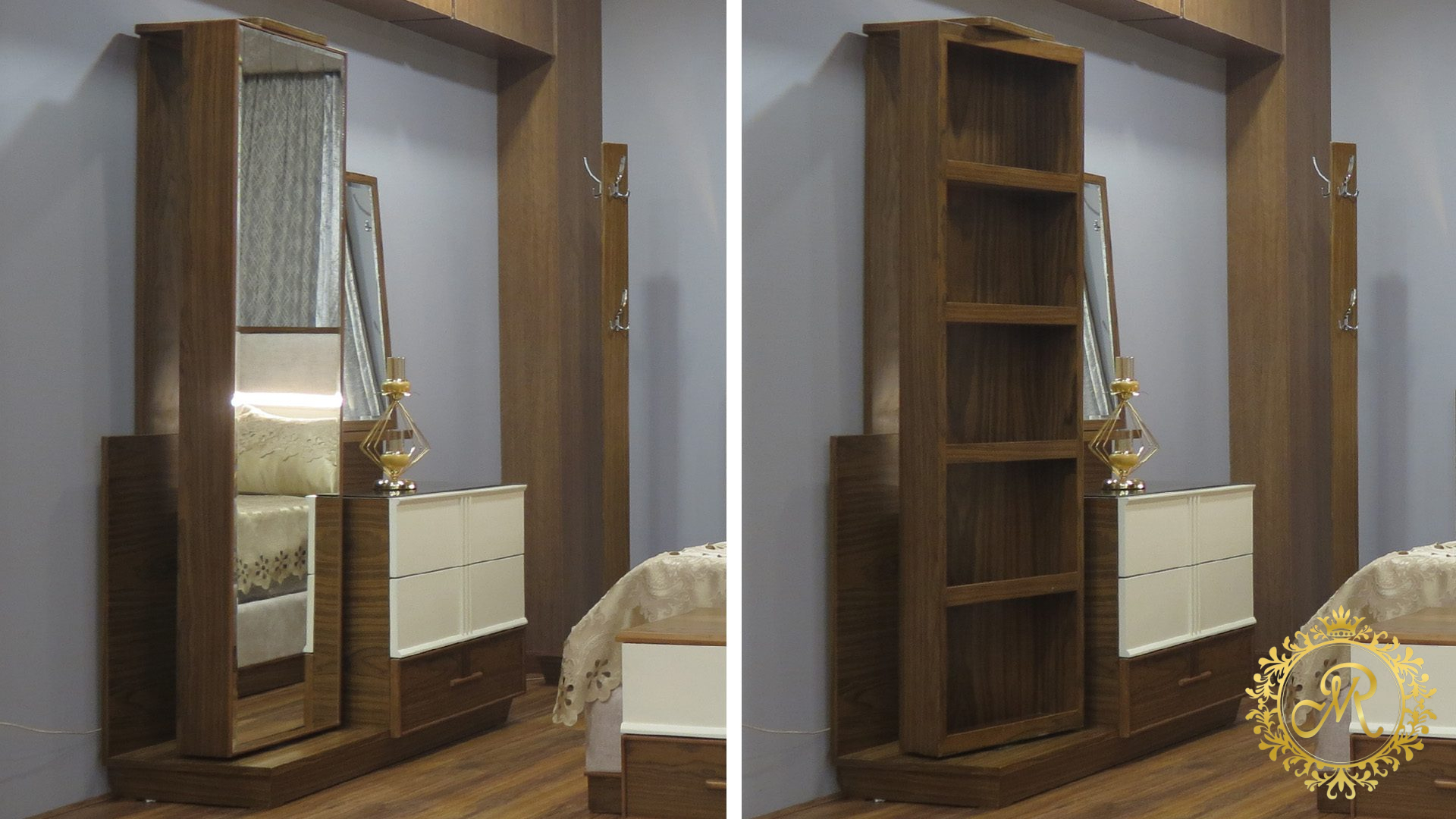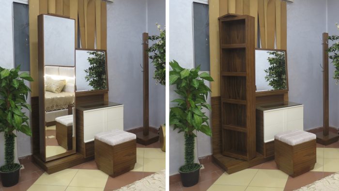 • مرآة تسريحة طولية ودوارة لمشاهدة كامل الجسد واستعمالها كأرفف لوضع متعلقاتك الشخصية.