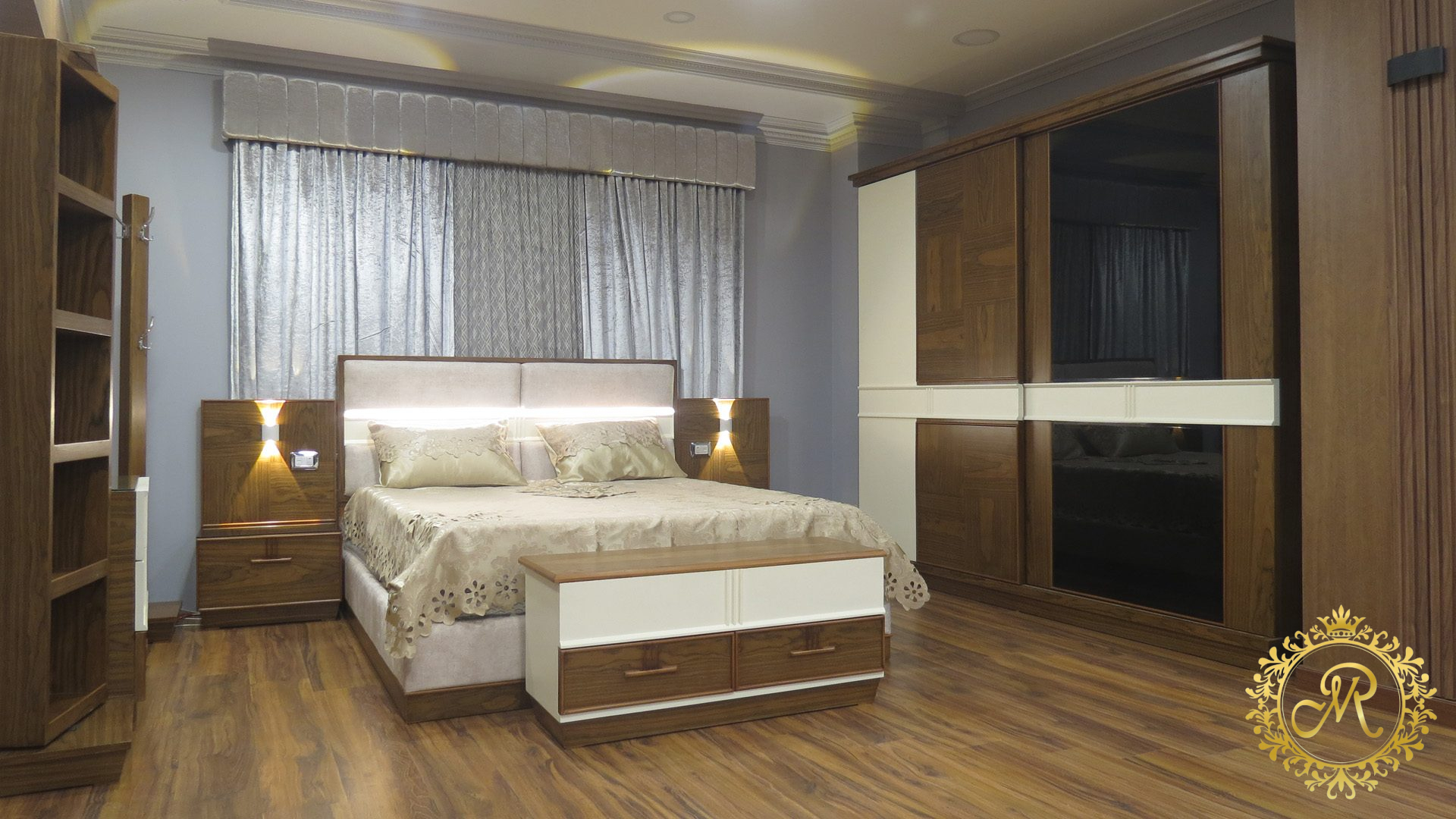 غرفه نوم مودرن 1018 المكونات: سرير كبير ، 2 كمود، تسريحة مع بف، دولاب كبير. الخامات: خشب زان أحمر مجفف