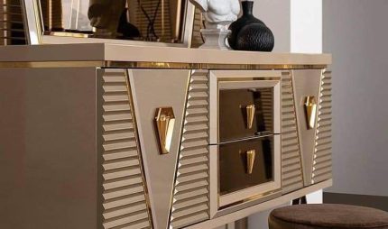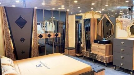 غرفه نوم مودرن 1007 المواصفات:  لها شكل مميز وبراق، وذلك لأنها مجلدة بشرائط زخارف في جميع قطع الغرفة. تتميز الغرفة