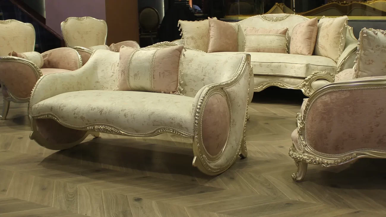 Mega صالون كلاسيك 3009 المواصفات: يتميز الإطار الخشبي المكشوف بتشطيبات فضية أو ذهبية مذهلة بهذا التصميم المنحني المتموج الذي يجمع